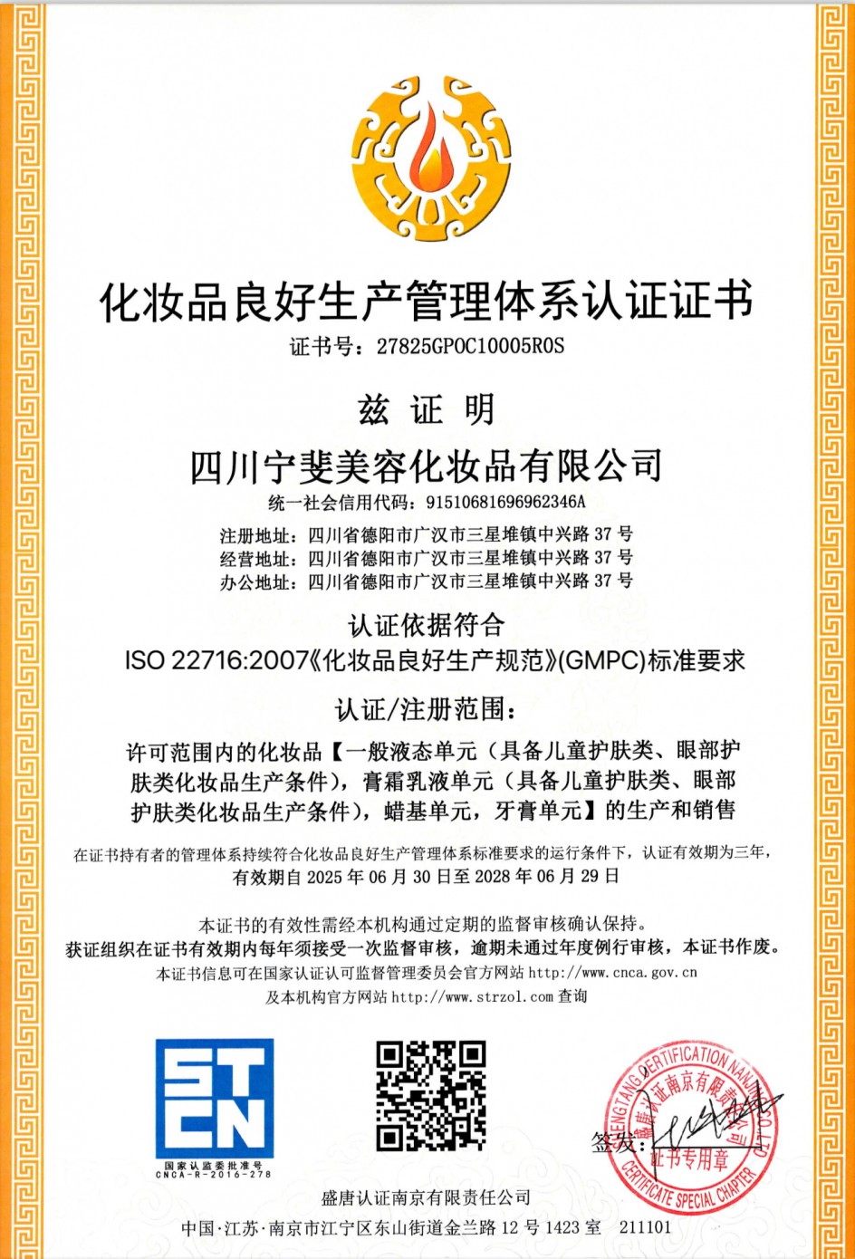 化妆品良好生产管理体系认证证书
